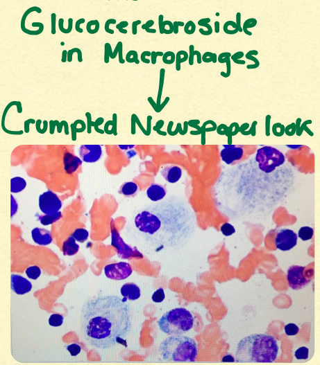 auto recessive Glucocerebrosidase deficiency –> accumulates in macrophages –> crumbled newspaper appearance