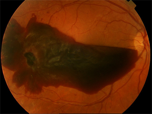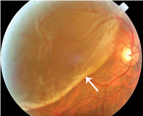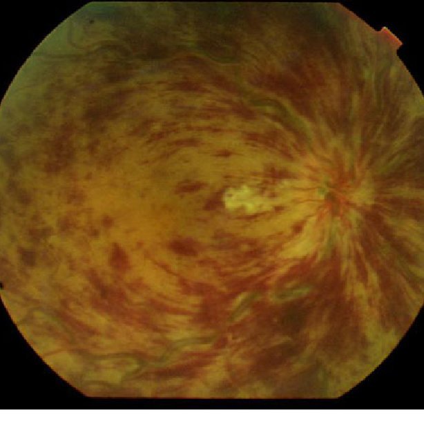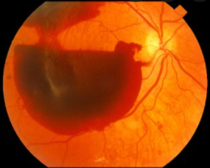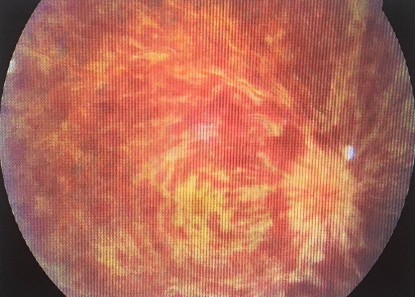 Fundoscopy = Dark Red Glow with Loss of Fundus details