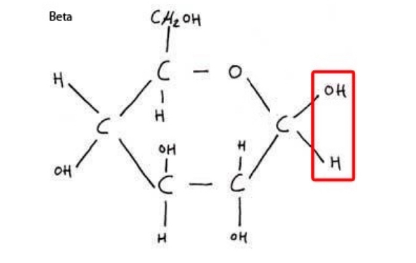 The structure of cellulose are straight 1-3 glycosidic bonds of beta glucose, with hydrogen bonds between the layers creating a fibril. Making it very strong.