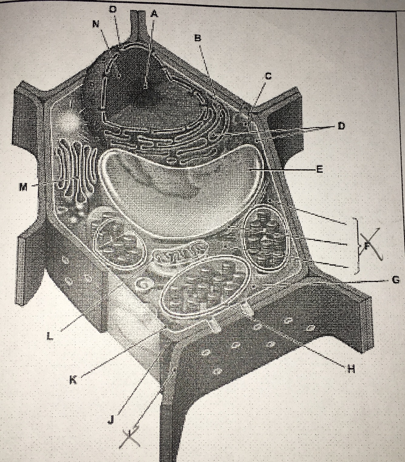 What letter represents the mitochondrion on the diagram below?