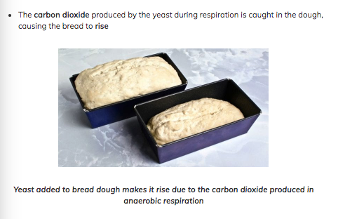 This is taken advantage of in bread making, where the yeast is mixed with flour and water and respires anaerobically, producing carbon dioxide: