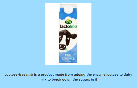 Milk can be made lactose free by adding the enzyme lactase to it and leaving it to stand for a while to allow the enzyme to break down the lactose