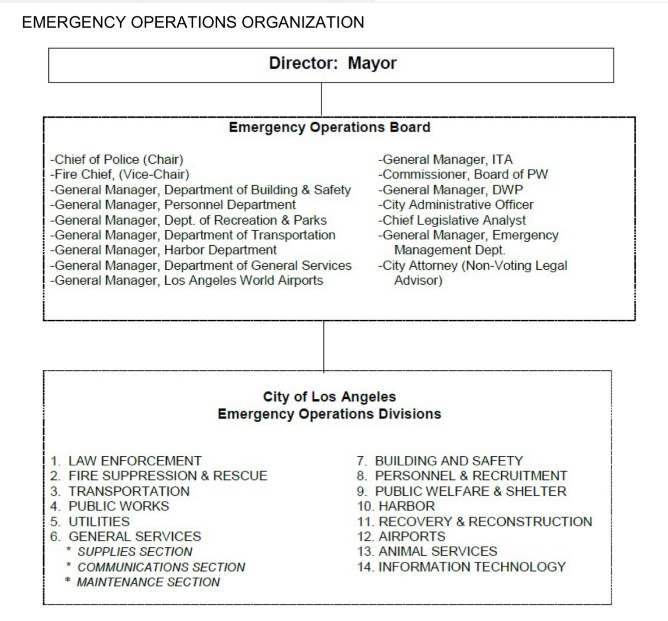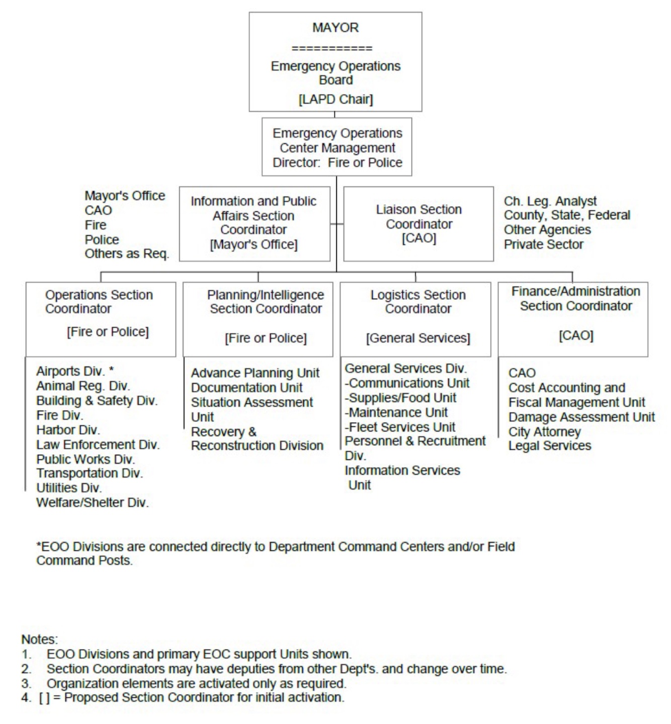 With the advice of the Emergency Operations Board (headed by the Chief of Police)), the Mayor exercises full authority over operations of the various Emergency Operations Organization (EOO) divisions.