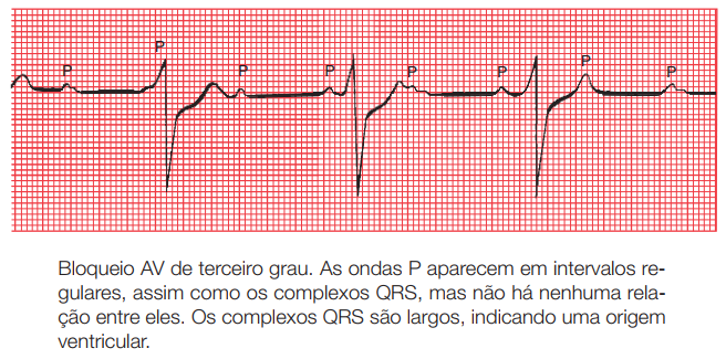Ondas P passando pelo registro de ritmo na sua frequência habitual (entre 60 e 100 bpm), mas sem nenhuma relação com os complexos QRS, os quais aparecem com um ritmo de escape muito mais lento.