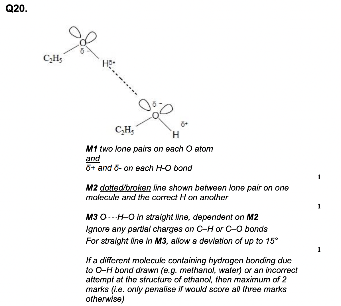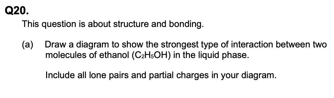 EQ: Draw a diagram to show the strongest type of interaction between two molecules of ethanol (C2H5OH) in the liquid phase.