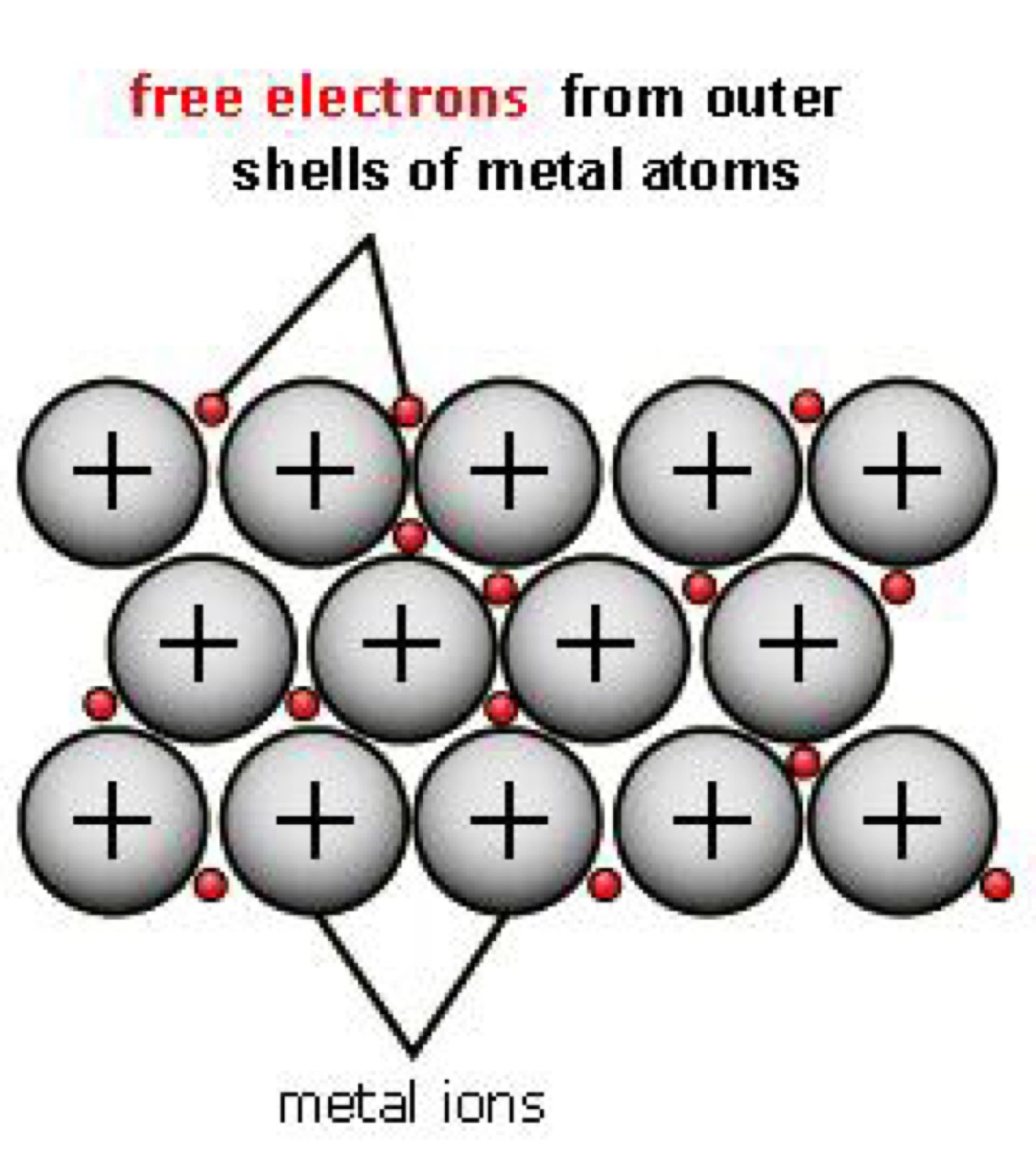 • delocalised electrons (same number of them as the overall positive charge, e.g. if the ion is 2+ then two delocalised electrons per ion)