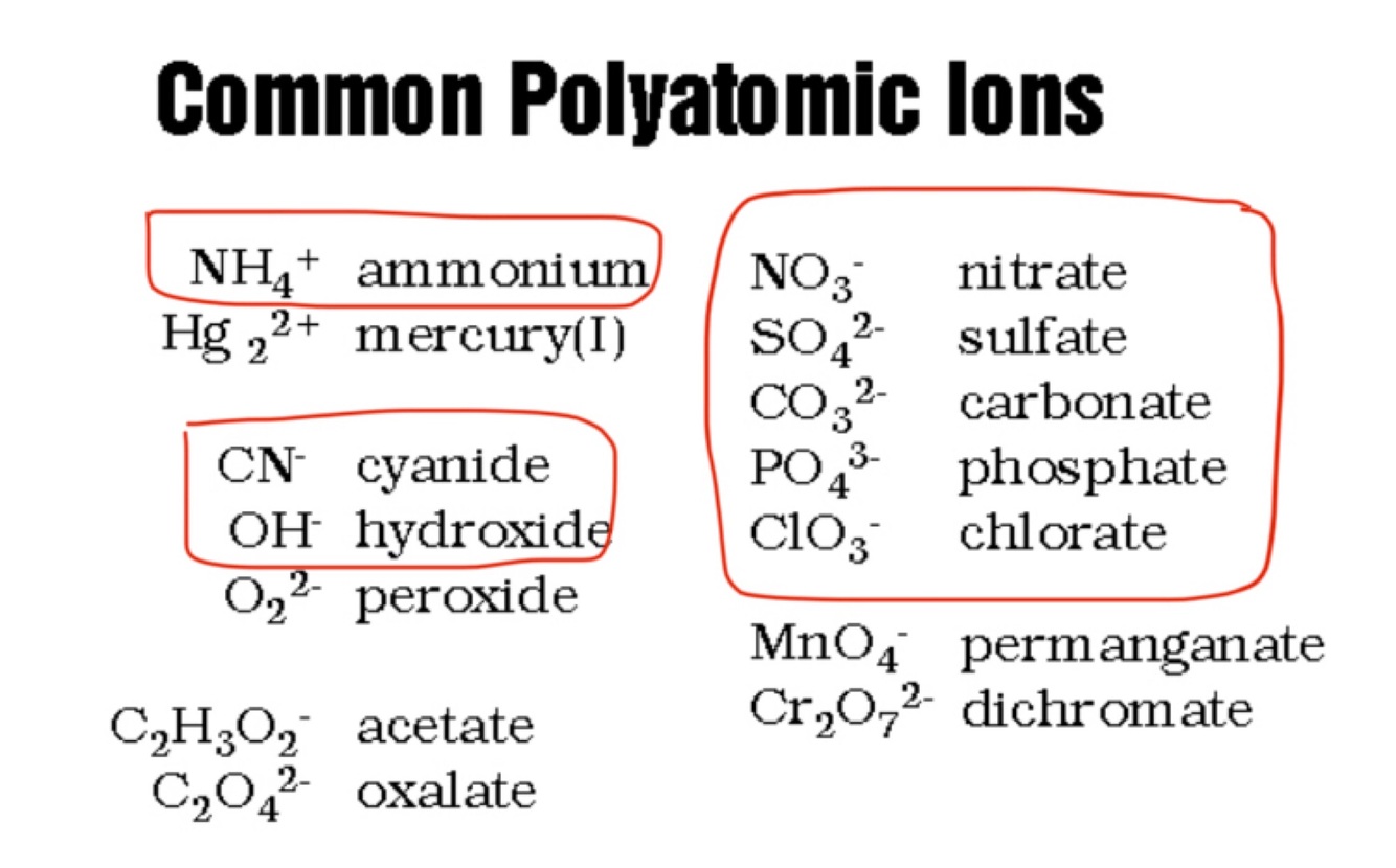 common polyatomic ions - ammonium, cyanide, hydroxide, sulfate, nitrate, carbonate, phosphate, chlorate