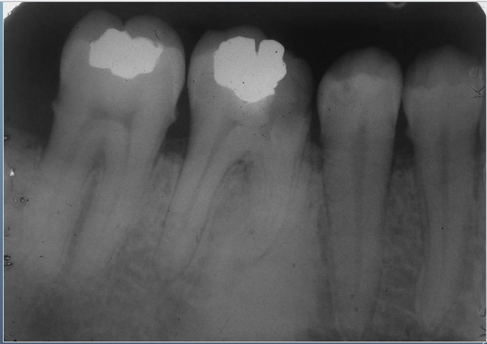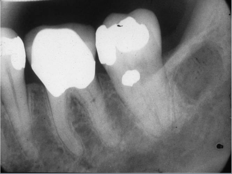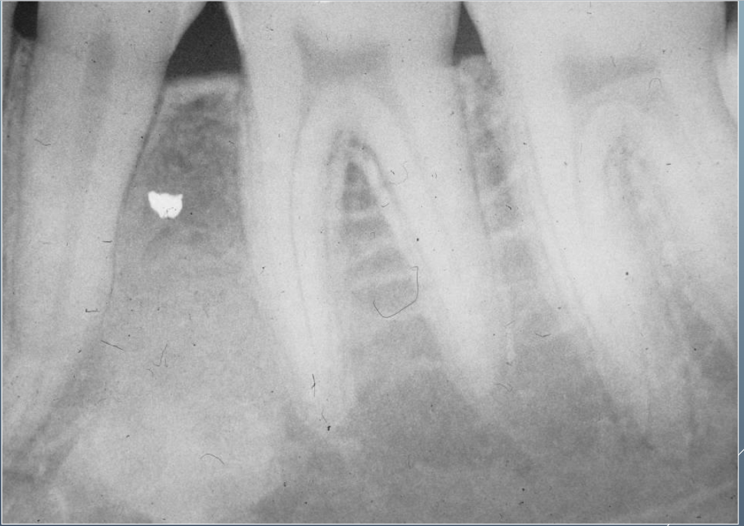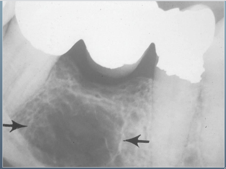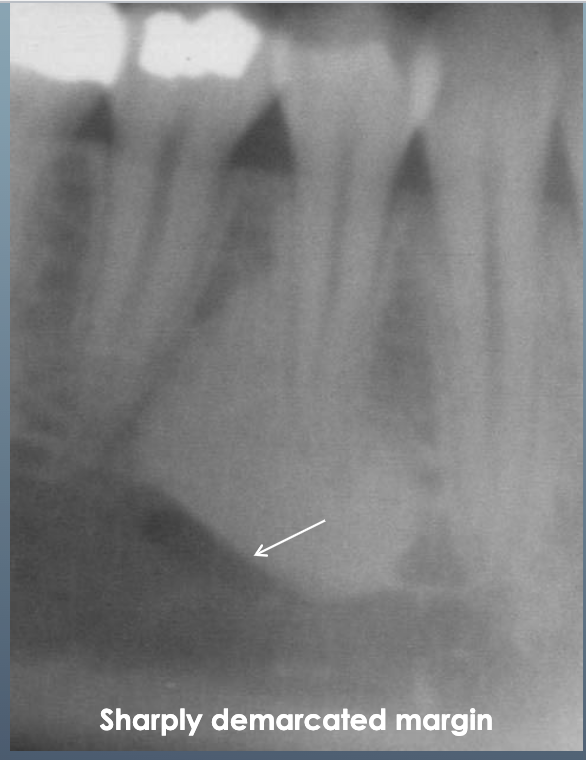Focal opacity associated with pathosis Mandibular molars and premolars of children and young adults No radiolucent border Not separated from apex
