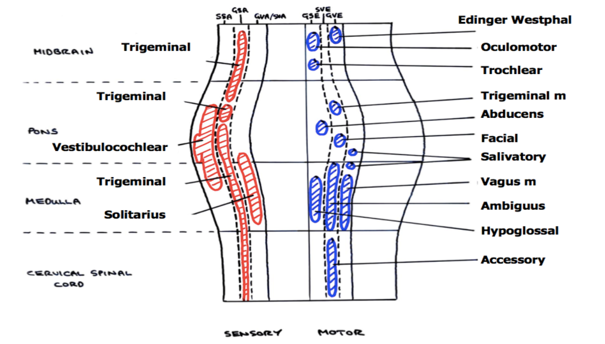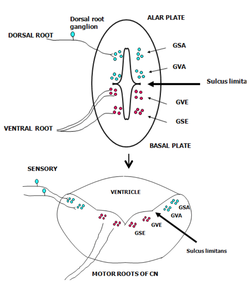 As the brainstem develops with the formation of the 4th ventricle, the alar plate opens up, thus spreading the functional columns into a particular distribution…