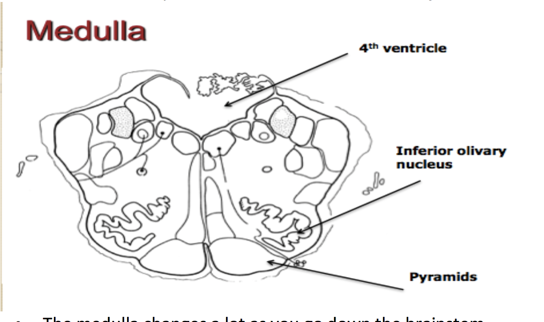 There is a bit of a bulge in the side of the medulla that’s a weird shape called the inferior olivary nucleus - this is connected to the cerebellum and is involved in fine tuning motor movements