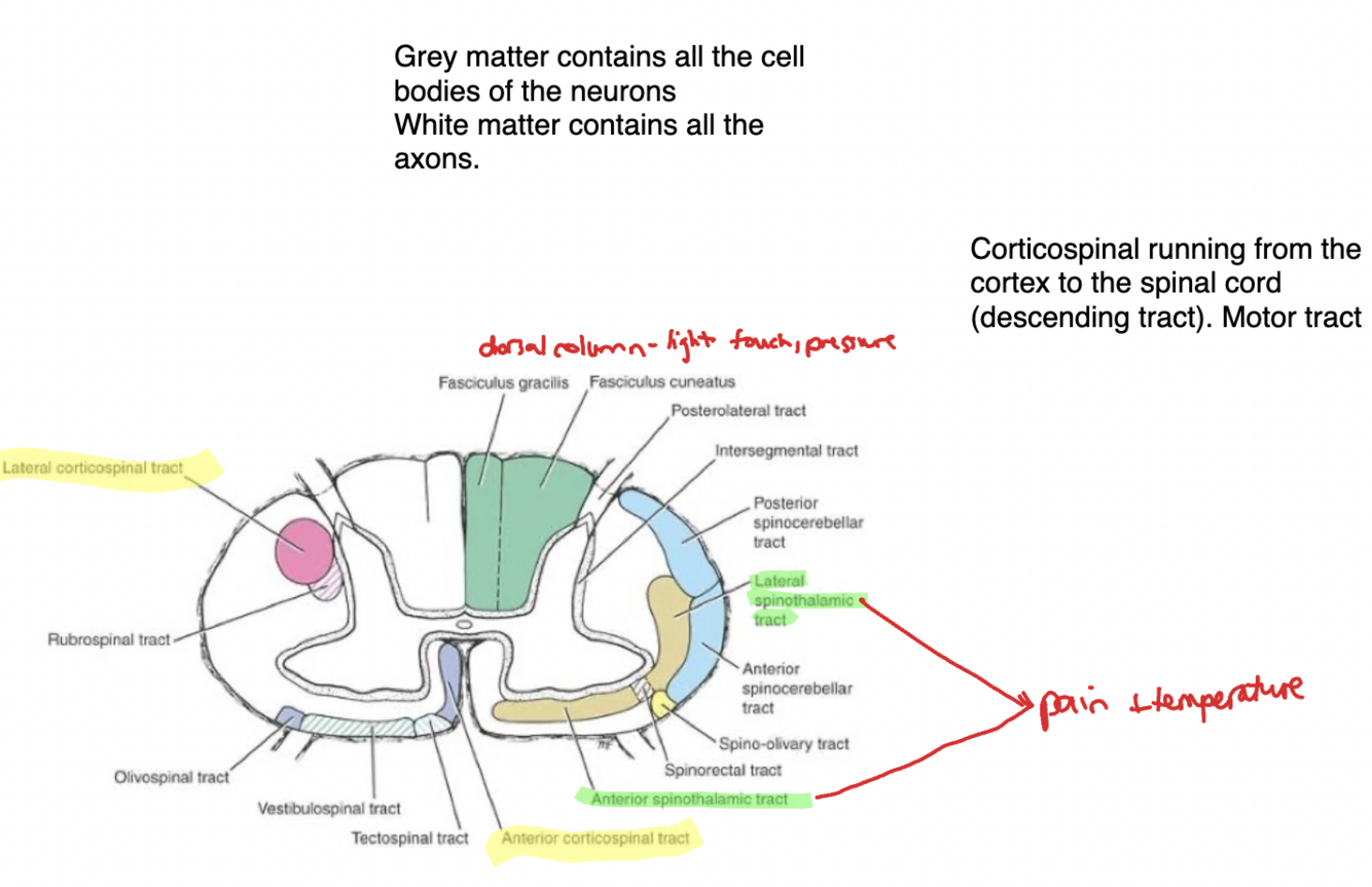 Label the 5 main tracts on this spinal cord and briefly say what they do