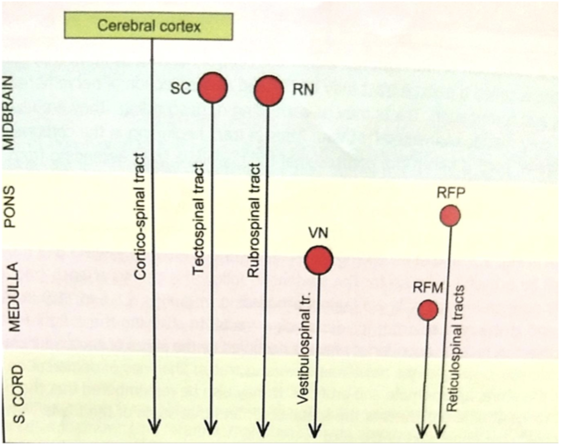 Tectospinal, rubrospinal tract=structures within the midbrain which further relay further down in the spinal cord