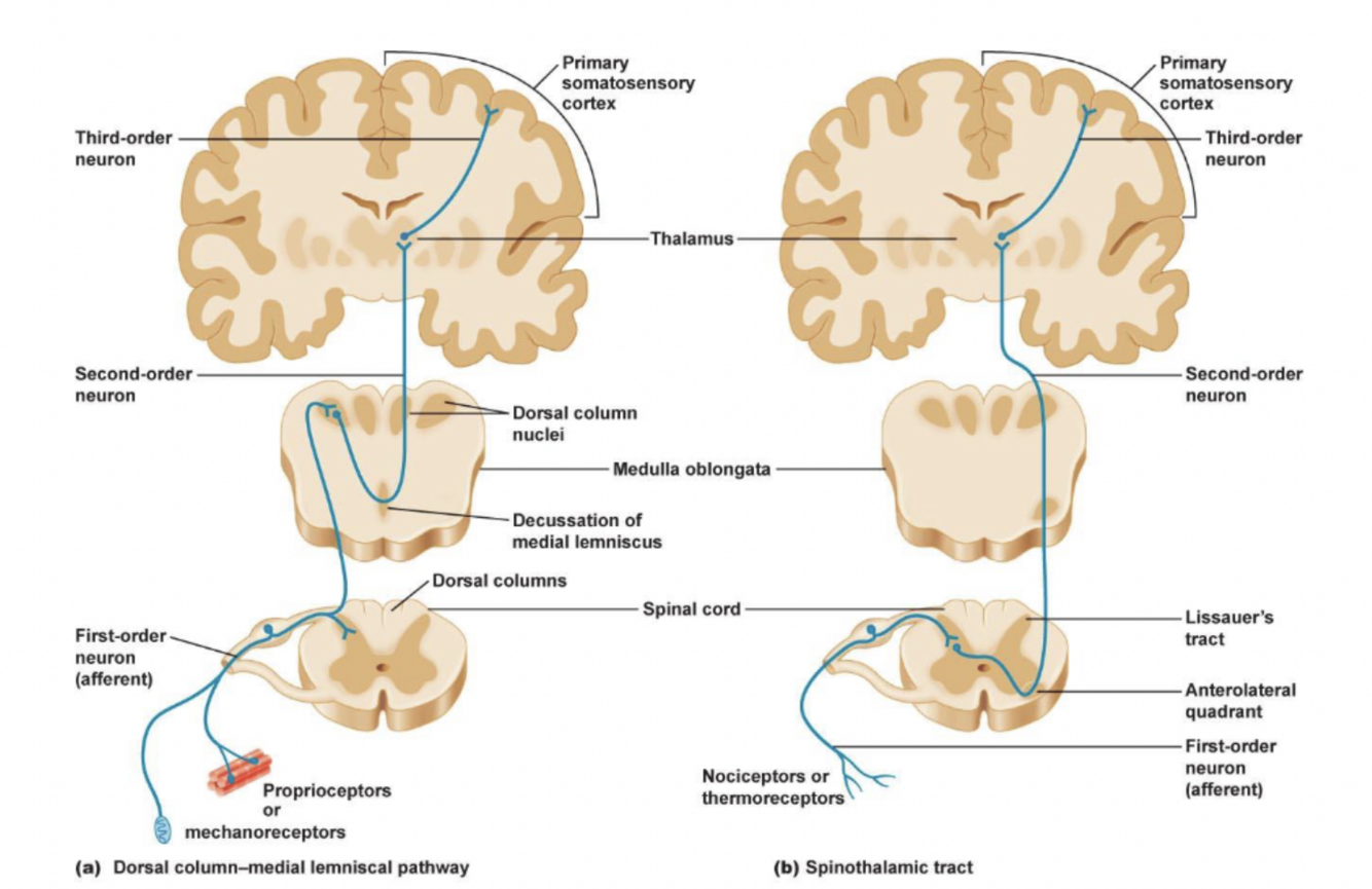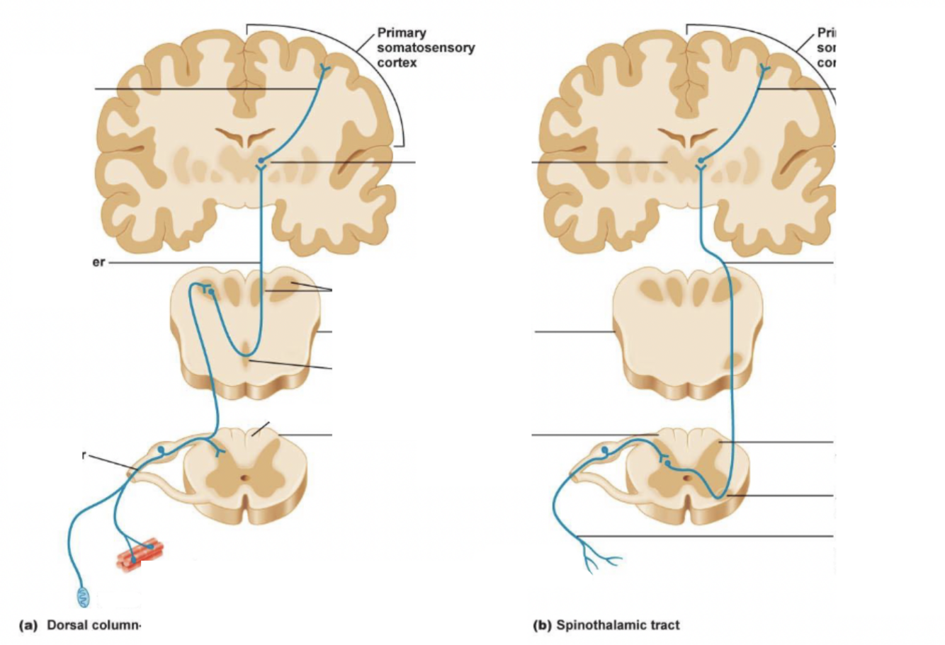Compare the dorsal column medial lemniscal pathway with the spinothalamic tract