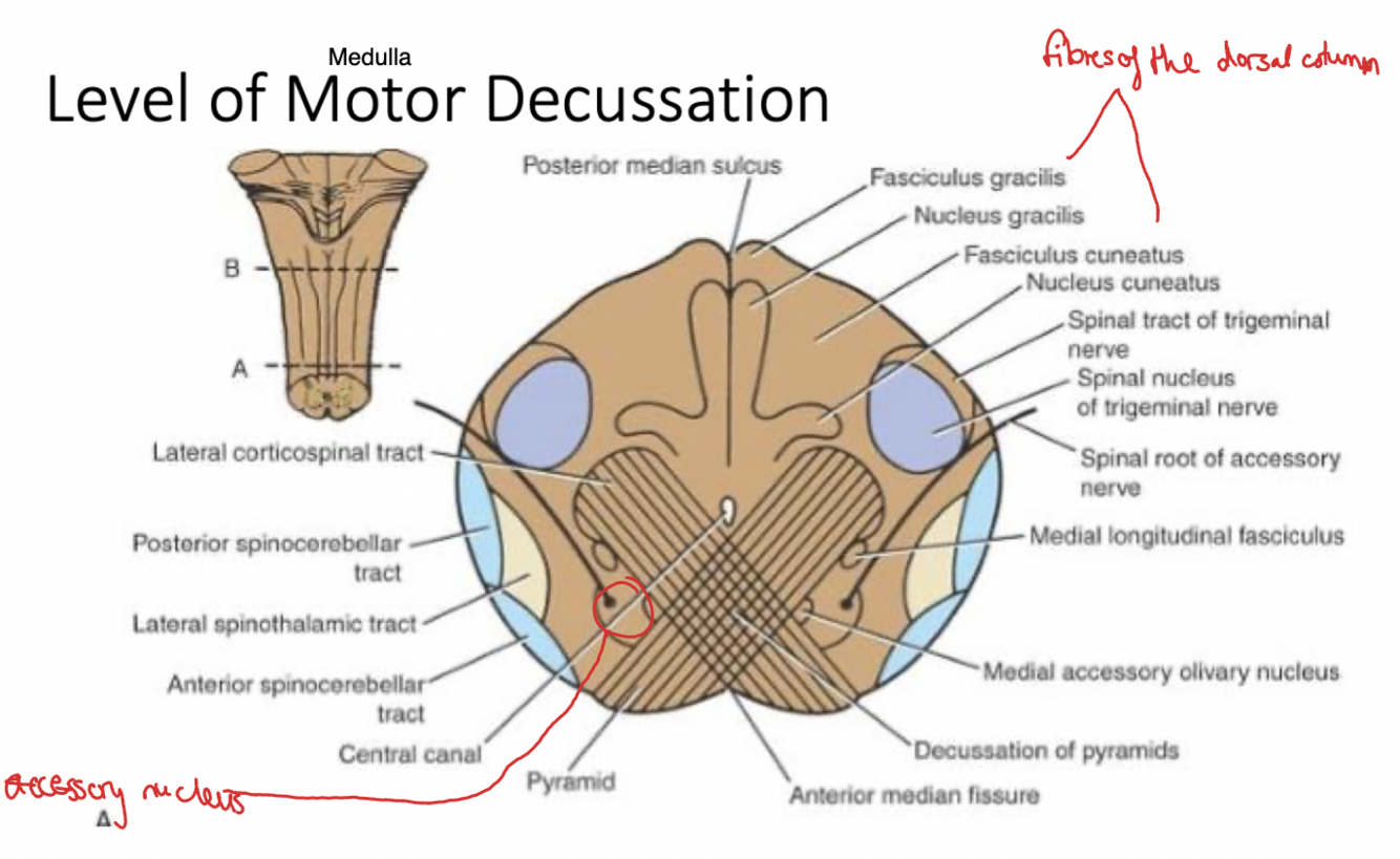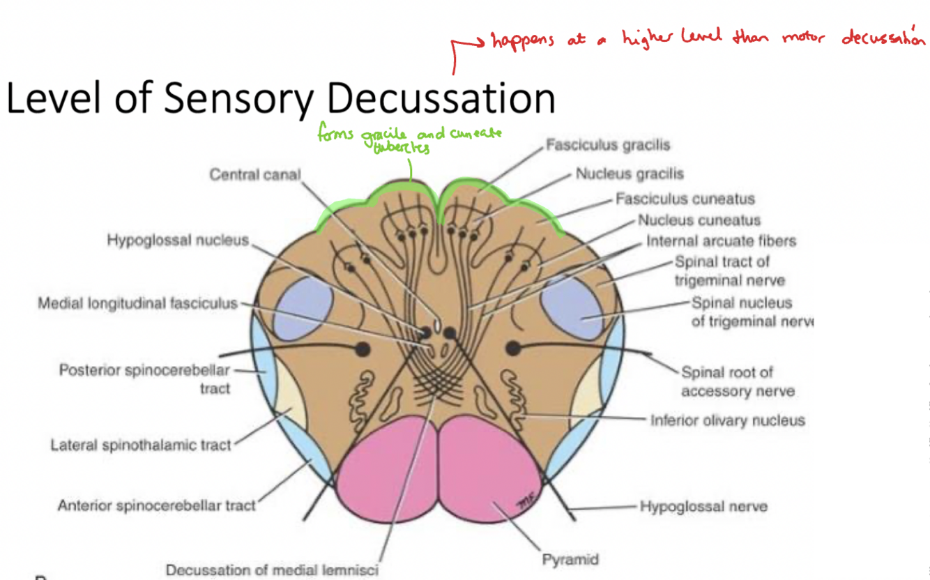 Explain the structures and what you would find at the level of sensory decussation