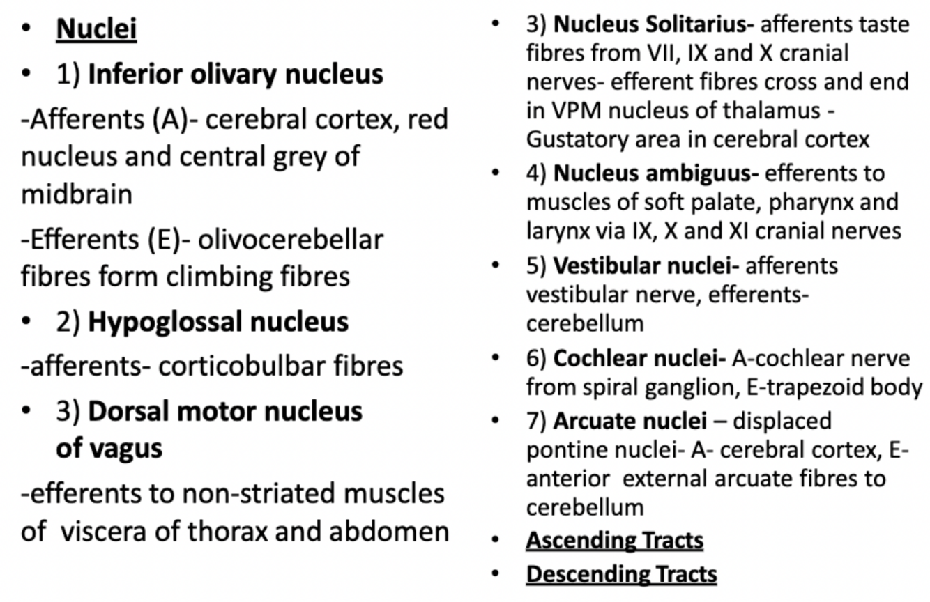 Which nuclei are found at the mid olivary level and what are their afferents/efferents?