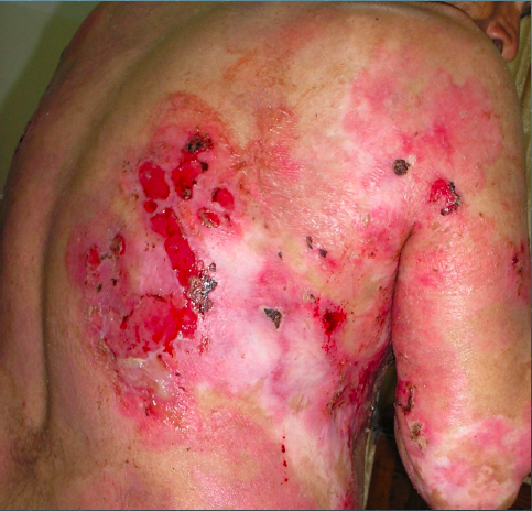 D) Lésions nécrolytiques épidermiques toxiques avec de grandes érosions.
