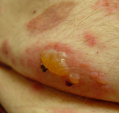 B) Papules et plaques urticariennes, ainsi que des bulles contenant du liquide séreux.