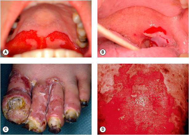 A, B) Presque tous les patients développent des érosions douloureuses de la muqueuse buccale, les localisations les plus fréquentes étant les muqueuses buccales et palatines; notez le glissement de la muqueuse dans (B).