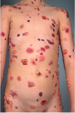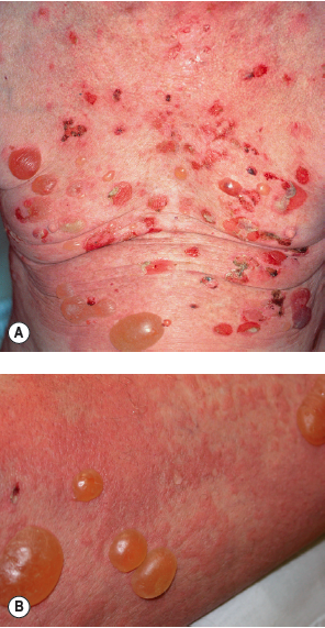 Bulles généralisées, tendues (fraîches) et flasques (anciennes avec réépithélialisation), ainsi que des érosions avec des croûtes hémorragiques.