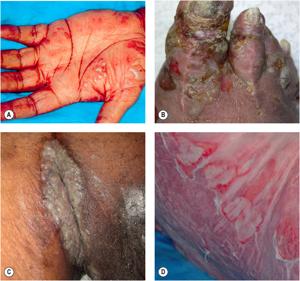 Vésicules groupées et bulles sur les paumes (A) et les orteils (B) pouvant ressembler au pompholyx (pemphigoïde dyshidrosiforme).