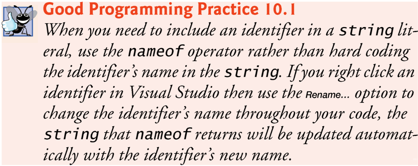 It’s common to include in an exception’s error message a variable’s or property’s identifier. As of C# 6, you can instead use the nameof operator, which returns a stringrepresentation of the identifier enclosed in parentheses.