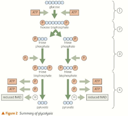 4) Dehydrogenation and formation of ATP - 2x triose bisphosphate are oxidised by removal of H atoms, form 2x pyruvate, NAD coenzymes accept removed H forming NADH, 4 ATP produced