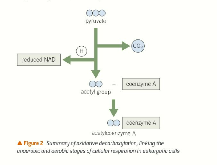1) CO2 removed from pyruvate and H removed from pyruvate (forming NADH), forming 2C acetyl group