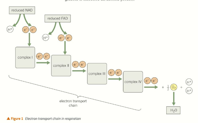 Reduced NAD oxidised at start of electron transport chain releasing protons and electrons, FAD oxidised further along