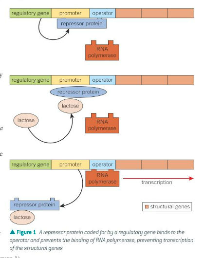 When lactose is present it binds to repressor protein changing its shape so it can no long bind to operator