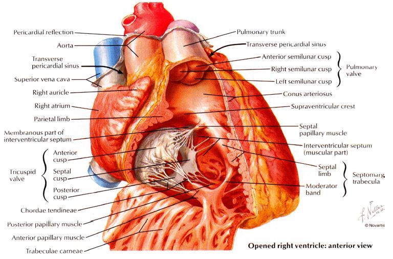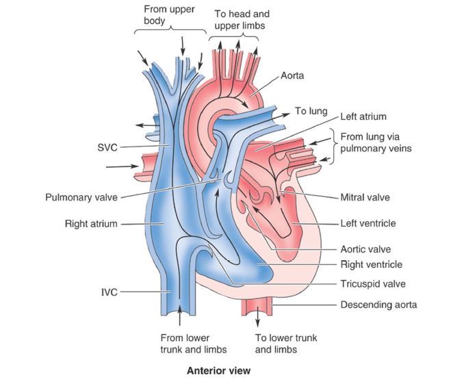 Describe the route blood takes through the heart, starting with deoxygenated blood from the body and head.