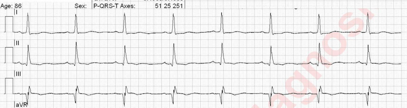 Patient with aortic stenosis. Increasing shortness of breath over the last weeks, waking up with respiratory distress. What is abnormal in this rhythm?