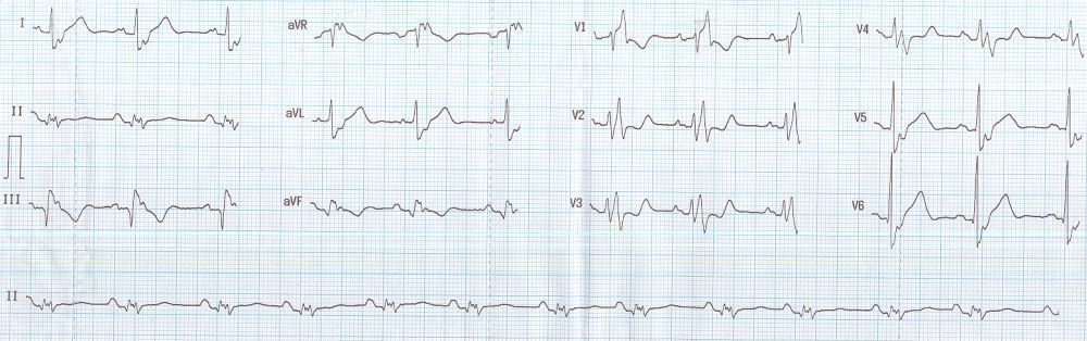 b) Prolonged T waves and large QRS secondary to hyperkaliemia
