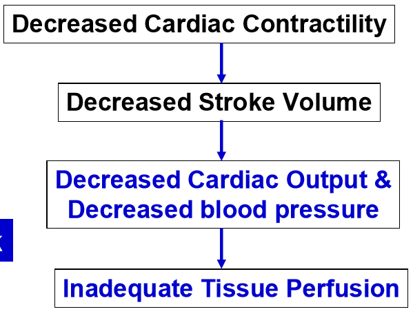 1) Reduced contratibility; decreases stoke volume so decreased CO; decreased BP; decreased coronary perfusion; cycle of ischaemia