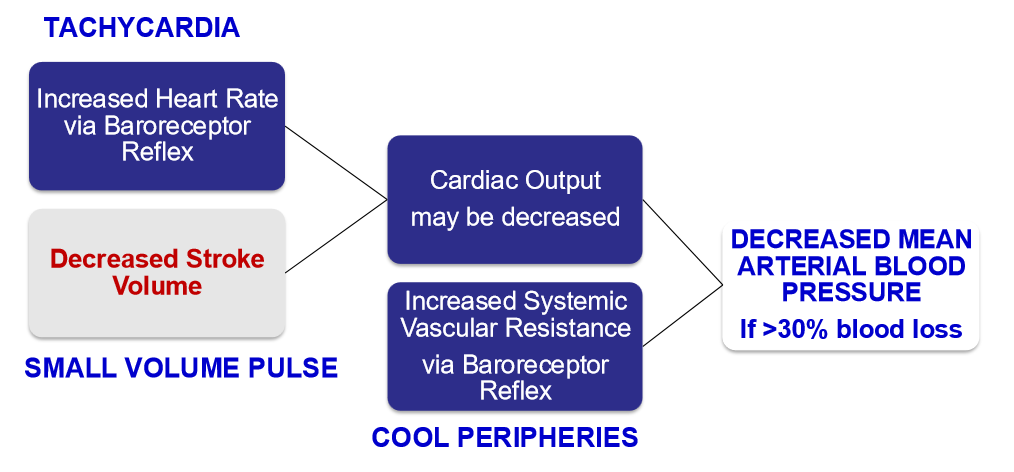 Compensatory mechanisms can maintain blood pressure until about >30% of blood volume is lost