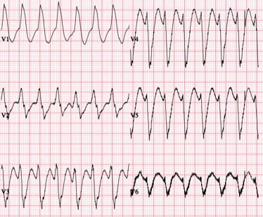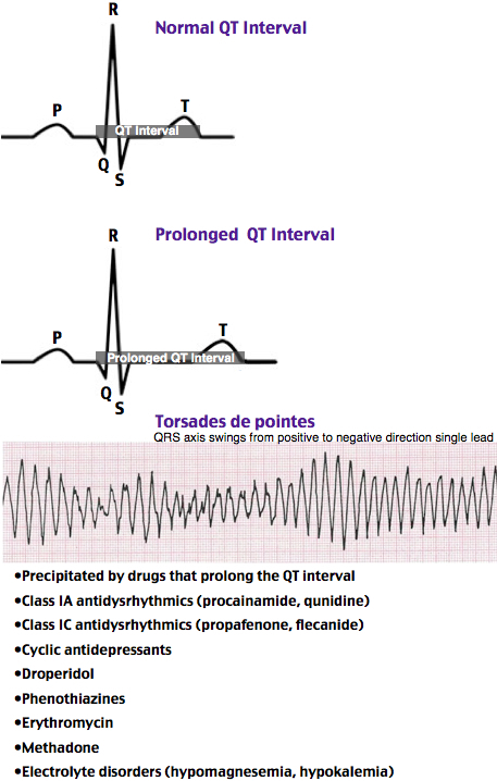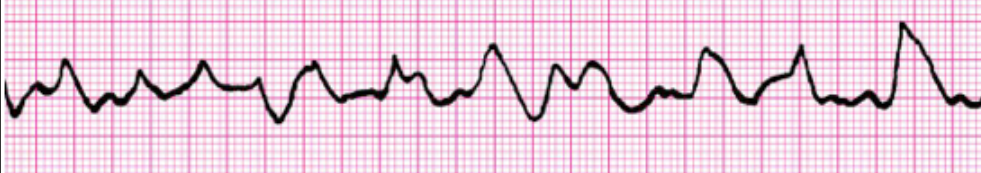 torsades de pointes = form of polymorphic ventricular tachycardia. fluctuating amplitude of the QRS complexes which appear to twist around the isoelectric line => V.fib