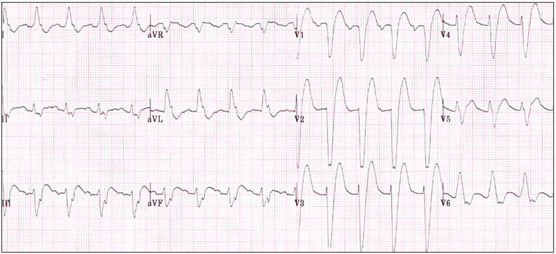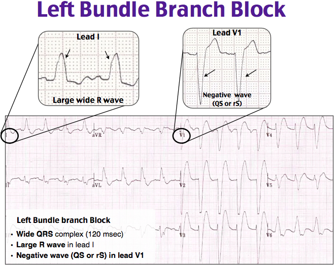 Bundle branch blocks are abnormal conduction abnormalities (not rhythm disturbances) in which the ventricles depolarize in sequence, rather than simultaneously, thus producing a wide QRS complex (> 120 msec) and a ST segment with a slope opposite that of the terminal half of the QRS complex.