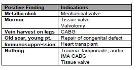 Indications; cardiac (see table), Aortic aneurysm/disection, ?rarely as an alternative approach to resection of lung cancer/oestophagus (the latter with extension), thymectomy (MS)