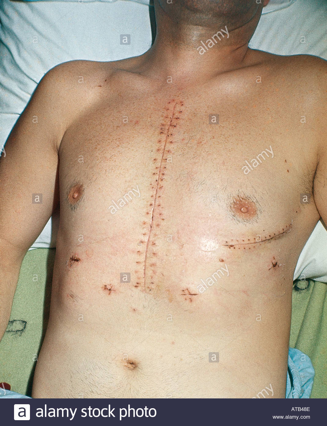 (Description This is a photograph of the wounds after cardiac surgery The wound in the chest is called a sternotomy because the sternum has been divided The sutures used to close the wounds have been removed leaving classic train track scars Puncture wounds where chest drains have been left and subsequently removed can also been seen)
