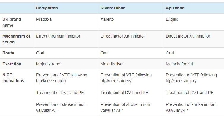 DOAC The table below summaries the three DOACs: dabigatran, rivaroxaban and apixaban.