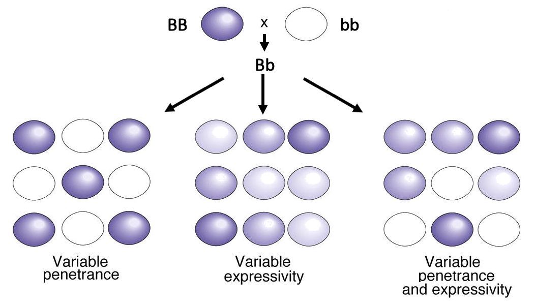 2. Variable Penetrance - Penetrance refers to the proportion of people with a particular genetic change (such as a mutation in a specific gene) who exhibit signs and symptoms of a genetic disorder