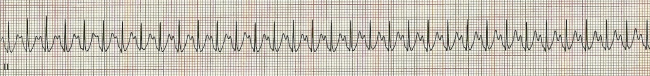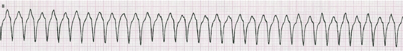 This rhythm is a very fast ventricular rate that has a wide QRS complex (ventricular beat). This rhythm is similar to atrial flutter in that it is a reentrant rhythm. The difference is that the ventricles (rather than the atria) fire at a dangerously fast rate. The rate is 100-200 BPM. Each beat may or may not cause ejection of blood into the arteries. A few of these beats in a row are not that big of a problem, but if this pattern is sustained it requires medical treatment and may require the defibrillator (paddle). If a person gets this a lot, an internal defibrillator may be implanted.