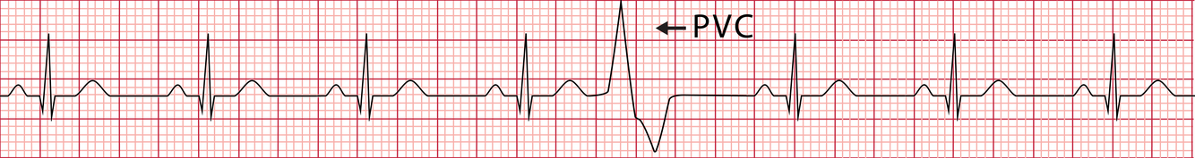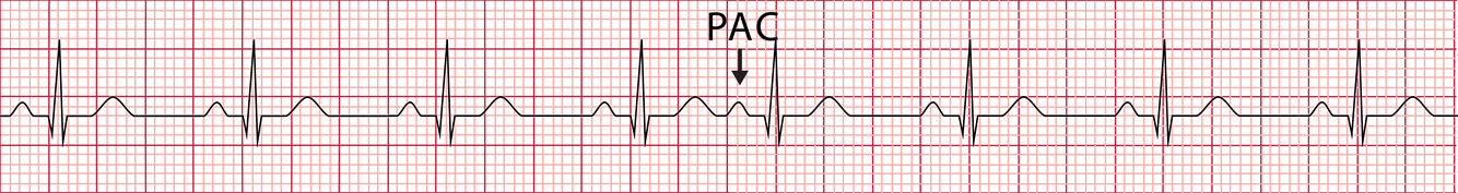 A premature atrial contraction occurs when some other pacemaker cell in the atria fires at a rate faster than that of the SA node. The result is a complex that comes sooner than expected. The complexes are otherwise normal, though the P-wave of the premature beat may be obscured by the T-wave of the previous beat.