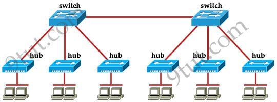 For your information, there are 7 collision domains in this exhibit (6 collision domains between hubs & switches + 1 collision between the two switches).