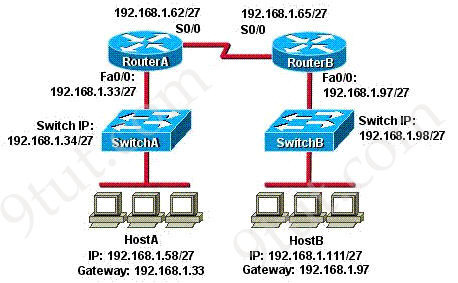 Refer to the exhibit. HostA cannot ping HostB. Assuming routing is properly configured, what could be the cause of this problem?