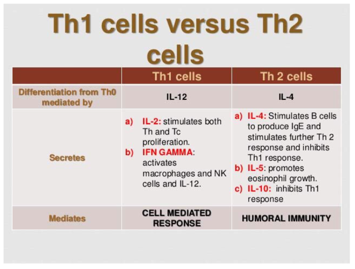 summarize the cyotkines secreted by Th1 vs Th2 and their actions