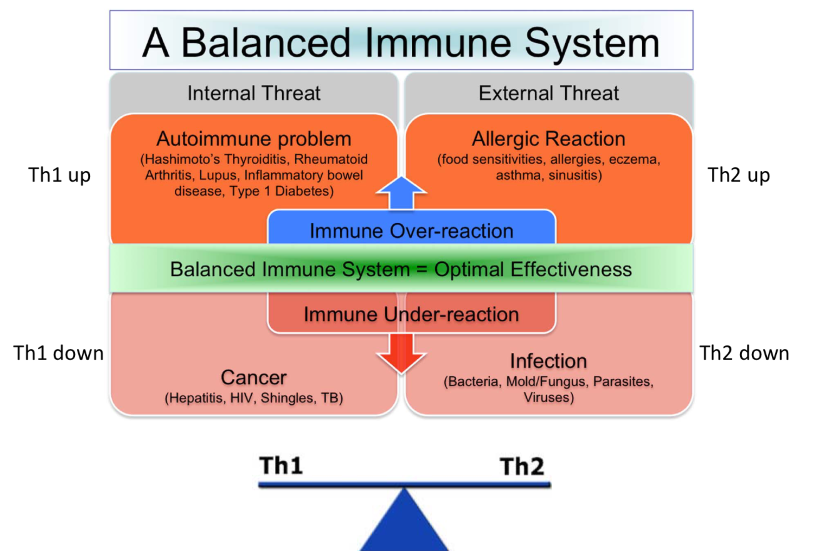 describe the balance of Th1 and Th2 and what occurs if one is increased vs decreased