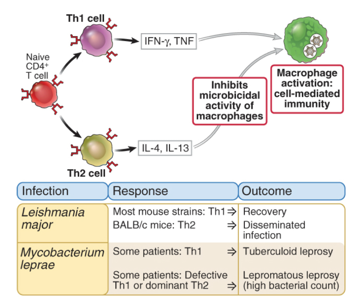 describe the balance between Th1 and Th2 as seen in Leishmania major and Mycobacterium leprae