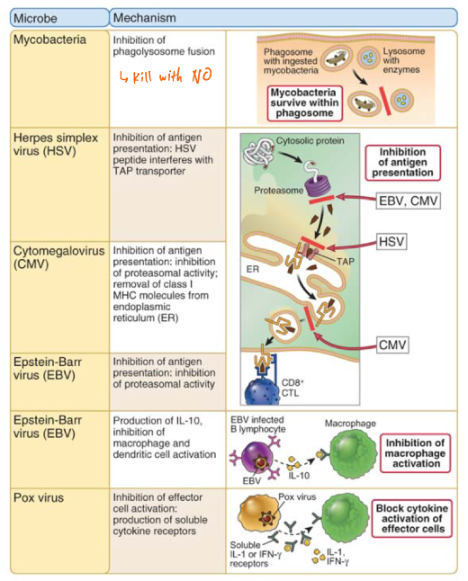 describe the microbe and the evasive mechanism of action within the cell (mycobacteria, HSV, CMV, EBV, pox virus)