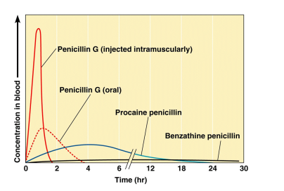 What is the prototype/standard penicillin? What are the ways in which it is administered? How do the various ways of adminstration differ?