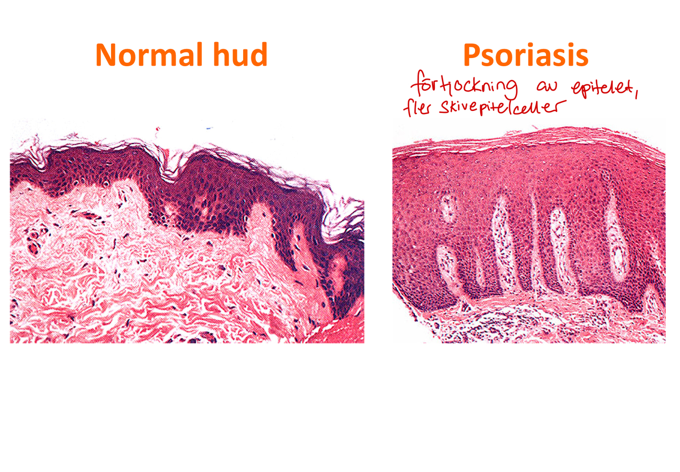 (BILD) Normal hud VS Psoriasis (förtjockning av epitelet, fler skivepitelceller)